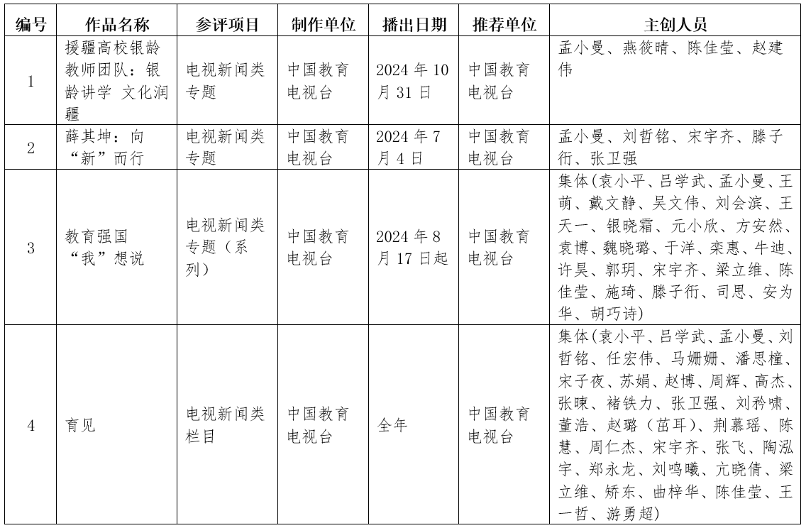 根据《国家广播电视总局办公厅关于组织开展第四届中国广播电视大奖·中国广播电视节目奖(2024年度)评选工作的通知》要求,中国教育电视台为初评单位,现在中国教育网络电视台对我台初评入选作品进行公示,欢迎社会各界监督、评议。如有不同意见,可在本公告公布之后的5个工作日内向中国教育电视台总编室反映。